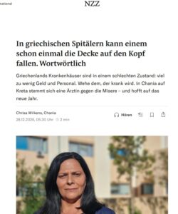 “Το να αρρωστήσει κανείς στις διακοπές του σε ένα ελληνικό νησί δεν είναι καλή ιδέα. Λείπουν γιατροί και νοσηλευτές, συχνά δεν υπάρχει επαρκής ιατρικός εξοπλισμός, ενώ τα κτίρια των νοσοκομείων δεν συντηρούνται όπως θα έπρεπε. Στα ελληνικά νοσοκομεία μπορεί κυριολεκτικά να σας πέσει το ταβάνι στο κεφάλι», γράφει η ελβετική εφημερίδα η Neue Zürcher Zeitung, μια από τις παλαιότερες και πιο έγκυρες εφημερίδες της Ευρώπης.